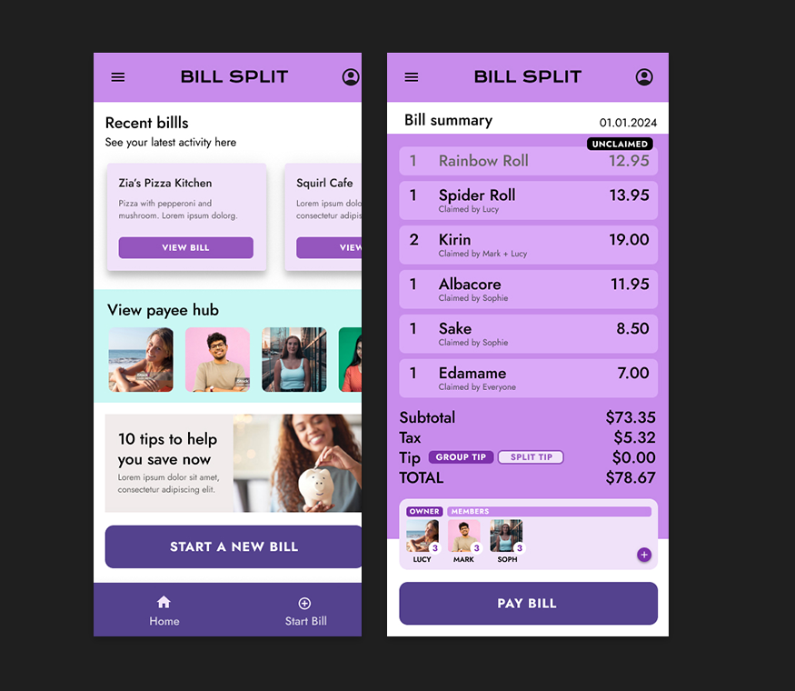 BillSplit is a mobile app designed to simplify the often awkward task of splitting shared expenses, whether its a dinner with friends or lunch with the family. The goal was to create a user-friendly experience that would make cost-splitting fast, fair, and frustration-free.
